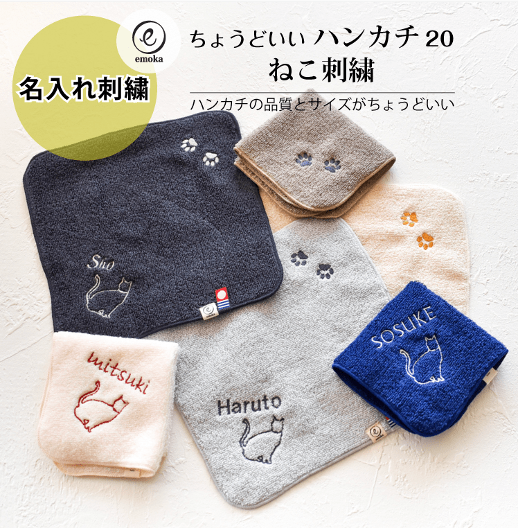名前刺繍可能 猫の落ちついたデザインのタオルハンカチ