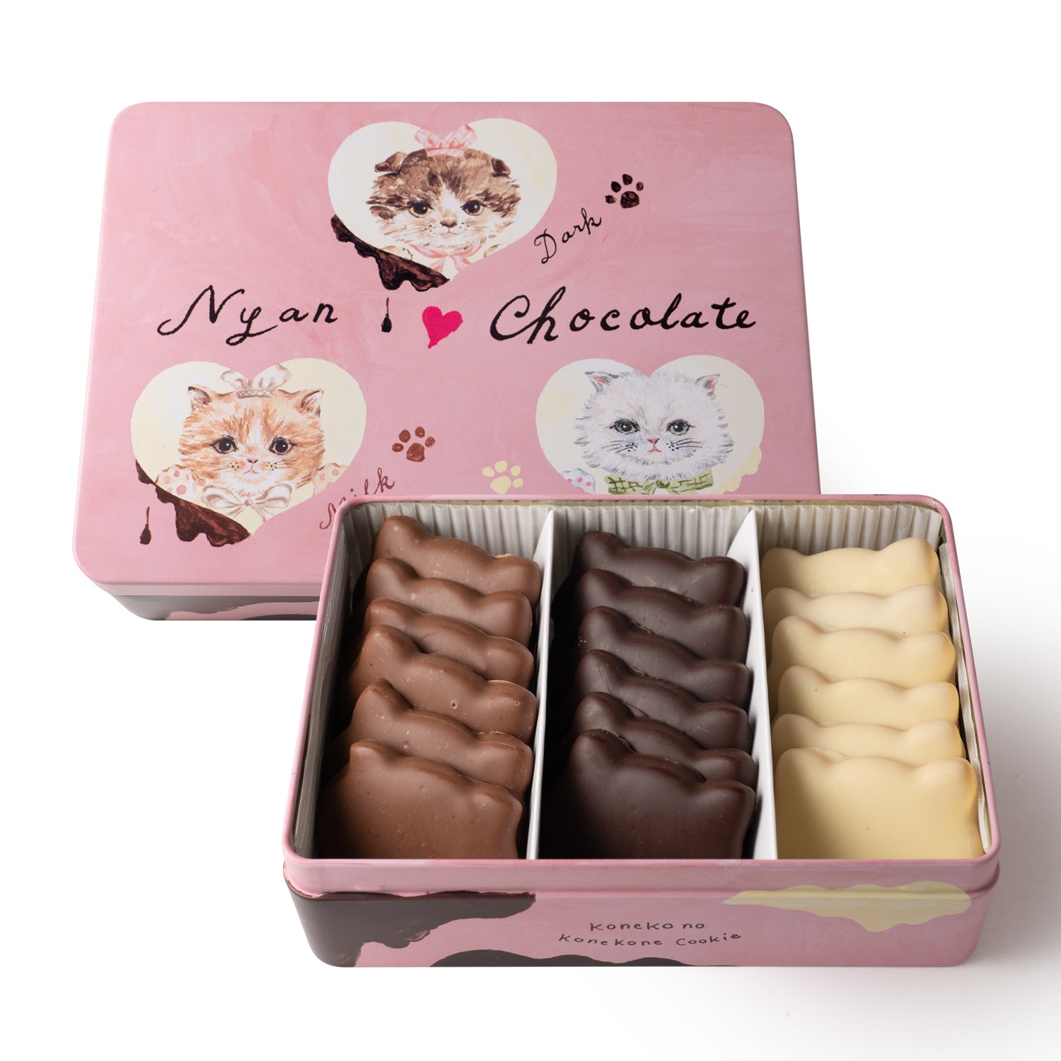 さくさくのねこ型クッキーにミルクチョコレート、ダークチョコレート、ホワイトチョコレートがコーティングされたクッキー缶。アソート缶18枚(3種×6枚)3,200円