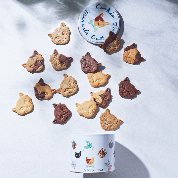 さくさくの猫顔クッキーは全部で5種類。イラストレーター利光 春華さんデザインの水彩やアクリル画を使用した優しいタッチで描かれた缶が印象的。1缶 2,500円