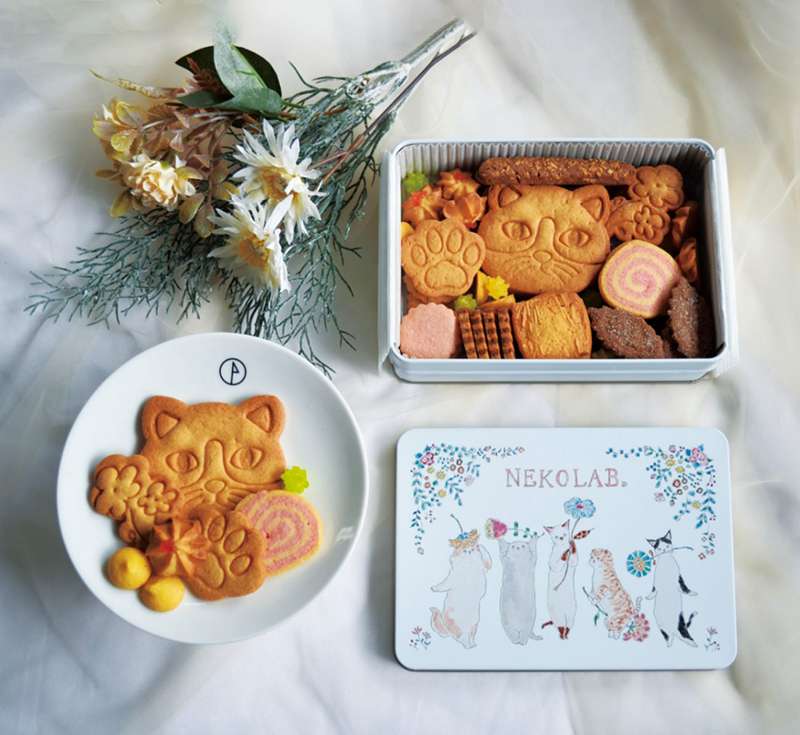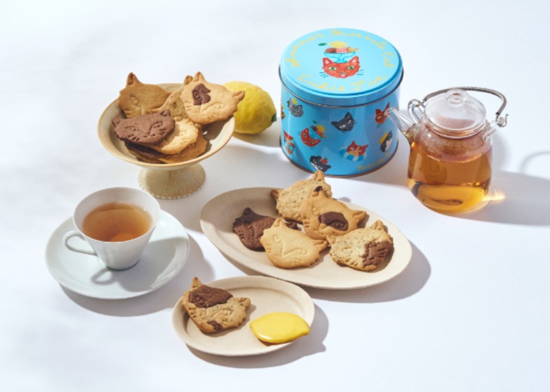 さくさくの猫顔クッキーは全部で5種類。イラストレーター利光 春華さんデザインの水彩やアクリル画を使用した優しいタッチで描かれた缶が印象的。1缶 2,500円