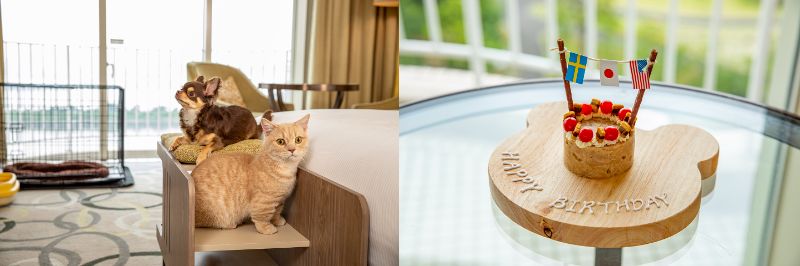 また、このプランでは、ペット用の就寝マットや食器、ドライタイプのキャットフードが客室に完備されているだけでなく、猫用の浴衣も用意されています。さらにペットの誕生日や記念日には、寒天やマグロ、マイクロトマトを使ったアニバーサリープレートのプレゼントもあります。