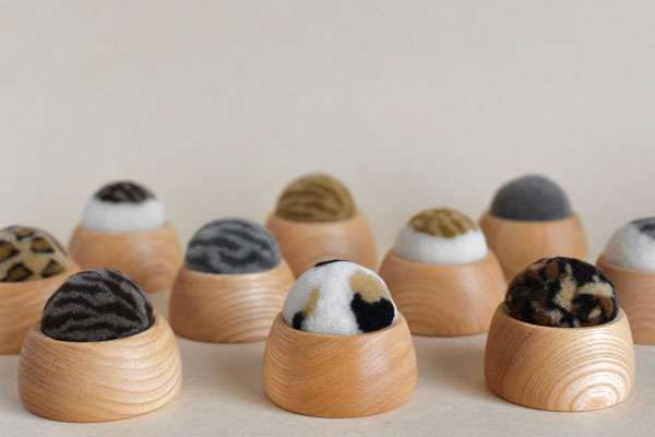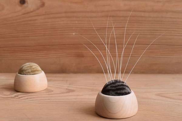 羊毛フェルトと木で作られた、針山(ピンクッション)のような「ネコの髭山(ひげやま)」です。