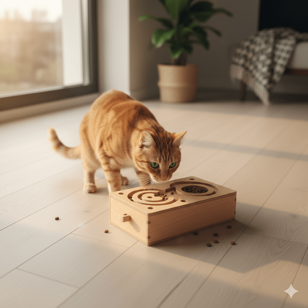 そこで注目されているのが、「フードパズル」や「採餌(さいじ)トイ」の活用です。ドライフードを転がさないと出てこない知育玩具や、家の中に少量のフードを隠して探させる工夫は、猫の「獲物を探して捕らえる」という本能を刺激します。