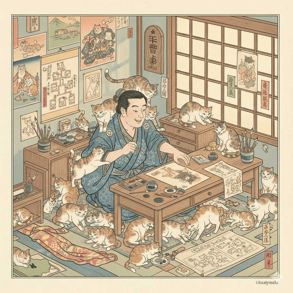 彼の描く浮世絵には、擬人化された猫や、猫が寄り集まって文字を作る「猫文字」など、猫への愛が爆発した作品が数多く残されています。しかし、凄いのは作品だけではありません。国芳の私生活は、まさに現代の「多頭飼い崩壊一歩手前」のような状態でした。
