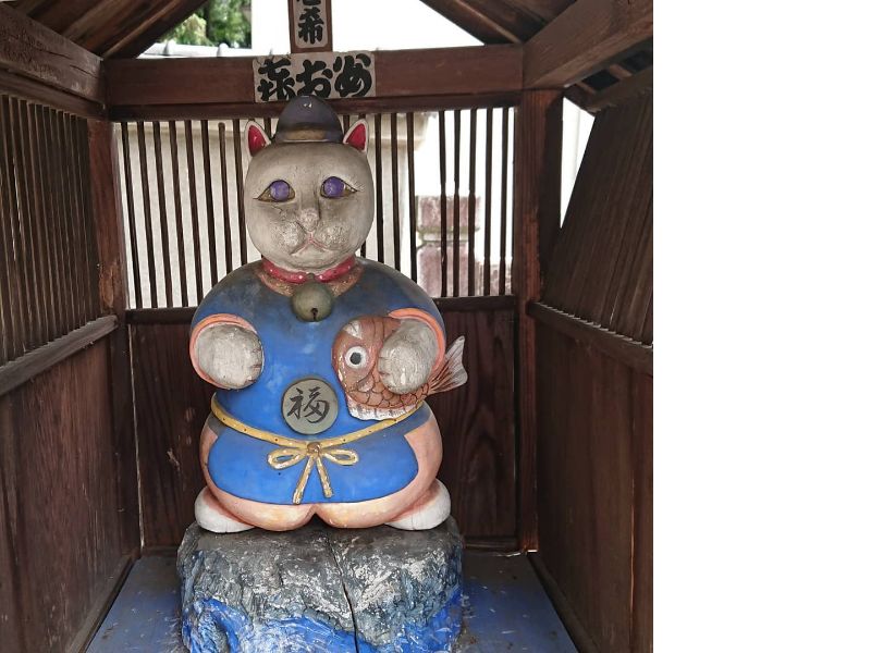 JR青梅駅よりレトロな街並みを歩いて5分ほど場所にある住吉神社には、阿於芽猫祖神(あおめまねき)という猫の道祖神があります。青梅市商店街が商売繁盛を祈願して奉納されたそうです。その横にも「大黒天猫」「恵比須猫」様もみることができます。青梅市は「猫をテーマとした活性化」を目指しているため、住吉神社に向かう道にも猫の看板を多くみかけるので探しながら散策してもいいかもしれません。地元のアーティストさんにデザインされた猫の御朱印ももらえます。映画「ちはやふる下の句」の決勝戦の撮影に祭殿が使われたそうです。